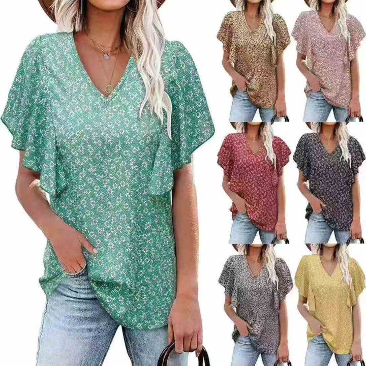 其他/其他 [爆竹][爆竹]3.9清700件欧美时尚休闲V领印花荷叶边袖口短袖,整款,花型图...